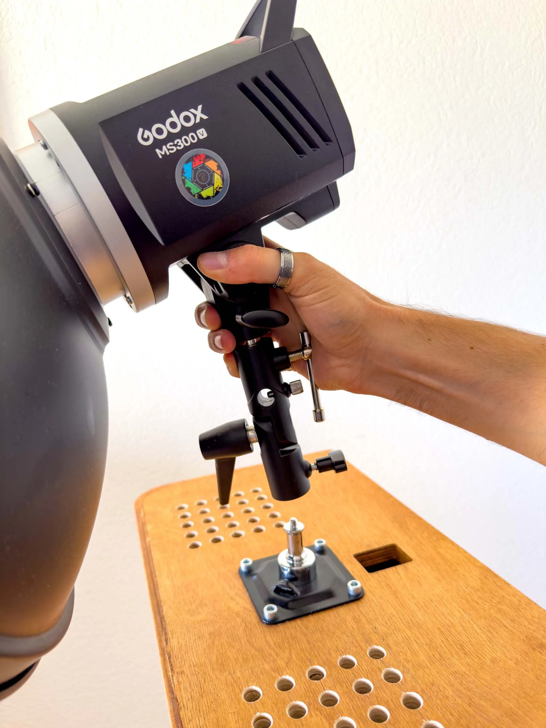 Nun steckt ihr den Blitz auf die Box und schraub sie mit der Schraube fest.